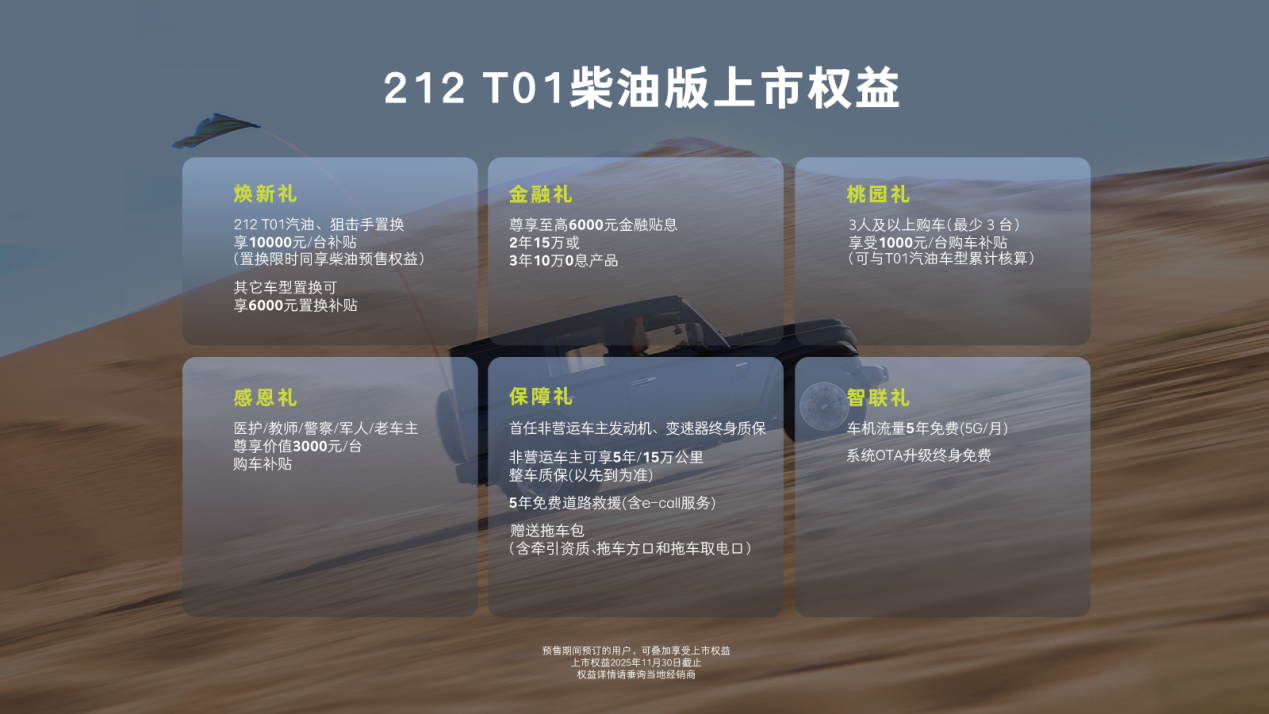 千公里穿越的从容应对,源于212 T01柴油版的硬核产品力;而长久驰骋的安心保障,则来自品牌对越野爱好者的深度考量。从组队穿越的默契协作,到老车主升级座驾的需求,从长途探险的售后顾虑,到日常用车的智能体验,212以六大上市专属权益,覆盖购车、用车、养车全场景,让每一份探索热情都能得到全方位支撑。尤其是焕新礼与保障礼,前者为老车主及置换用户提供专属支持,让升级座驾、延续越野情怀更轻松;后者则针对复杂路况量身打造,以长效质保与免费救援服务,为长途穿越、无人区探险等旅程筑牢安心防线,让“说走就走的越野”不止于口号。